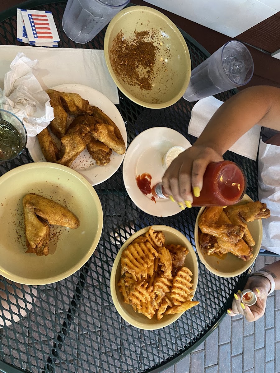 Finally I tried this place and was satisfied!! The wings were perfectly fried. It was very light and crispy. Their hot and bourbon honey bbq sauces were perfect with crispy wings. I don’t have to go to Buffalo anymore! Taco salad was also great!! Cash only. p.s. A grandma sitting at the next table put her knife into ketchup bottle to dig ketchup and licked her knife. I’ve never seen and thought someone could do that in the restaurant. ============================= We always used to eat wings outside at this restaurant, but because of the sweltering weather, no one could sit out there, so for the first time, we sat inside. Looking out at the lush green trees through the window gave me a healing and peaceful moment. I loved the that spot.